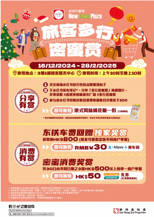 一簽多行啟動(dòng)后,赴港旅客激增,香港沙田新城市廣場(chǎng)趁勢(shì)推出年終矩獻(xiàn)活動(dòng)-旅客多行密蜜賞,通過(guò)旅客互動(dòng)與參與,分享與消費(fèi),多重驚喜獎(jiǎng)賞加持,體驗(yàn)在香港沙田新城市廣場(chǎng)一站式購(gòu)物狂歡。即日起至2025年2月28日,香港沙田新城市廣場(chǎng)推出雙重活動(dòng)分享有賞與消費(fèi)有賞。旅客可通過(guò)邊逛邊參與的方式,增加年終購(gòu)物的樂(lè)趣與驚喜。分享有賞:關(guān)注商城小紅書(shū),分享「多行密蜜賞」圖片并發(fā)布筆記,帶相應(yīng)話(huà)題,即可免費(fèi)領(lǐng)取港式風(fēng)味棉花糖一份。消費(fèi)有賞:在香港沙田新城市廣場(chǎng)消費(fèi)滿(mǎn)800元,即可領(lǐng)取30元支付寶東鐵車(chē)票乘車(chē)禮贈(zèng),承包你的路費(fèi)獎(jiǎng)賞。憑30日內(nèi)三次以上滿(mǎn)額消費(fèi)單據(jù),即可獲贈(zèng) 50元萬(wàn)寧或屈臣氏禮券。
