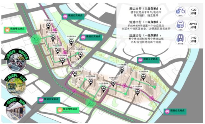 采用出行距離為導(dǎo)向的三級交通組織架構(gòu),通過高效整合公共交通資源,實現(xiàn)地鐵、公交及非機動車等多種交通方式的互補與融合,并確保各層級交通流線緊密銜接,為居民提供了更加舒適、便捷的出行體驗。同時效緩解了城市交通壓力,提升了整體交通系統(tǒng)的效率與服務(wù)質(zhì)量。
