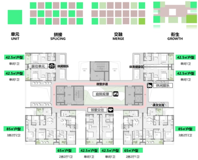 我們綜合考慮社區(qū)布局的合理性與高效性,采用單元模塊化推演方法。通過精細(xì)化的設(shè)計,這些單元模塊能夠自由組合,靈活融入社區(qū)的各項功能之中,從而構(gòu)建一個既多元化又統(tǒng)一和諧的居住環(huán)境。在此基礎(chǔ)上,設(shè)置了一體化微社區(qū)活力連廊,這些連廊巧妙地連接起各個居住單元,不僅延伸了家的半徑,更在情感上拉近了居民之間的距離。