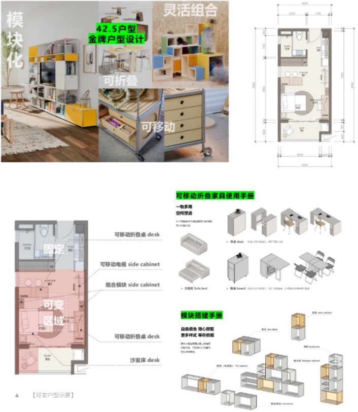 項目將實行統(tǒng)一的交付標(biāo)準(zhǔn),根據(jù)設(shè)計指標(biāo),我們引入了折疊、移動及模塊化家具的概念,這些家具元素共同構(gòu)成了一個靈活可變的區(qū)域系統(tǒng)。該系統(tǒng)允許租戶根據(jù)自己的使用習(xí)慣和具體場景需求,自由地進行DIY設(shè)計,從而打造出專屬于自己的個性化生活空間。