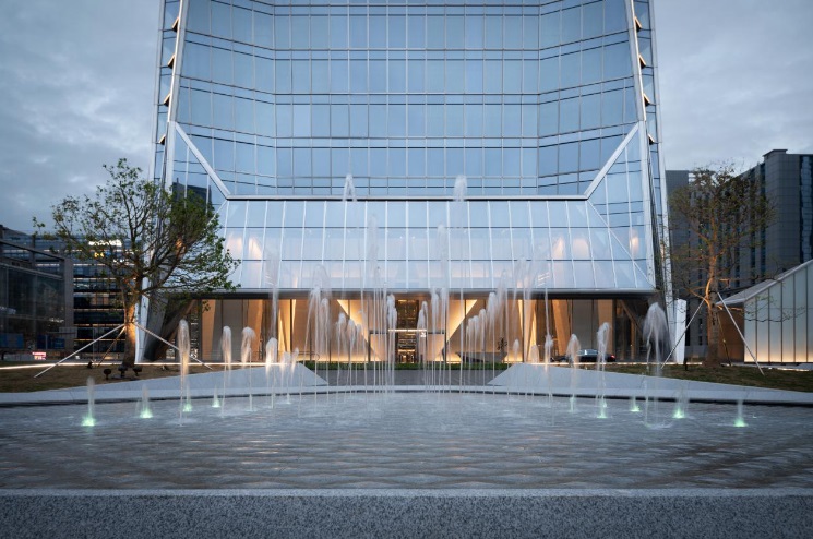 由AECOM擔任設計的“都市哲疊”中央景觀廣場,以水景,四時景觀禮序共融,營造賓至如歸的辦公場景;東廣場設置聚會和休憩空間,西廣場結合穹頂一體式雨棚,與立面折面設計相呼應,打造無風雨落客平臺;