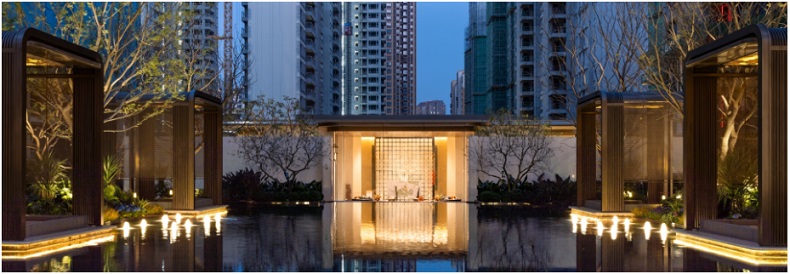 入場第一眼,超1000㎡的中庭水院,復(fù)刻悅榕莊經(jīng)典水景中軸,潘多拉奢石景墻與樹王對景,一條巨大的水景中軸迎面而來,兩旁樹陣列隊,宛若隆重的儀仗,迎接時代人物的盛大到來。