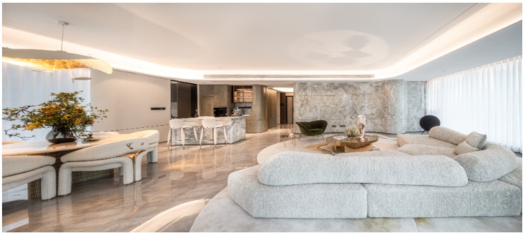 LDKB一體化宴會方廳,270°環(huán)幕全景采光,以城市天幕極景為背景,仿佛置身旋轉(zhuǎn)觀景臺。巨大的安第斯雪景奢石背景墻,為空間賦予奢華的質(zhì)感,蒸烤一體化設(shè)計餐廚臺可選配升降水龍頭,健康、智能的生活理念根植于空間的每一處設(shè)計。