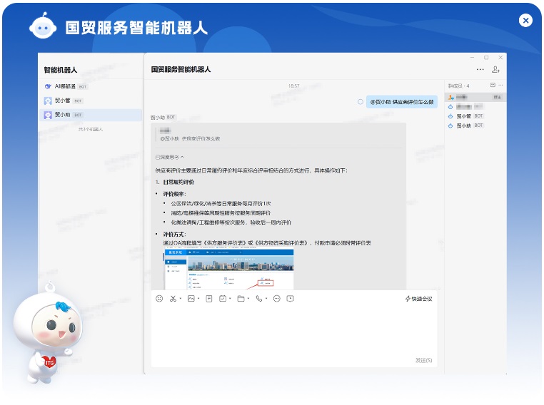 值得一提的是,面對當(dāng)下AI科技創(chuàng)新涌動的時代浪潮,國貿(mào)服務(wù)于近日依托企業(yè)微信,成功接入DeepSeek,正式推出“AI員工”智能機(jī)器人“貿(mào)小助”,開啟工作模式向智能化、數(shù)據(jù)驅(qū)動化轉(zhuǎn)變的探索嘗試。隨著應(yīng)用的深入,這位“AI員工”展現(xiàn)出持續(xù)進(jìn)化的特質(zhì)。后續(xù)智能機(jī)器人還將陸續(xù)加入由國貿(mào)服務(wù)建立的梯位業(yè)主群,輔助提供咨詢服務(wù),高效響應(yīng)客戶訴求,持續(xù)提升客戶滿意度。