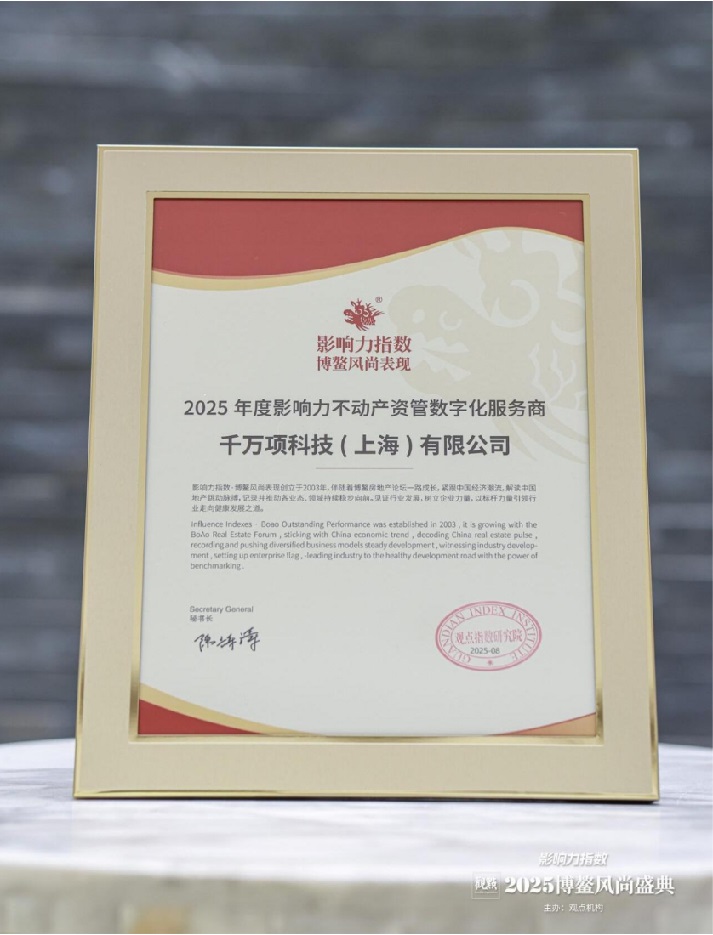 。2025年8月13日,海南博鰲) 盛大舉行的2025博鰲房地產(chǎn)論壇上,千萬項(xiàng)科技(上海)有限公司(以下簡稱“千萬項(xiàng)”)憑借其領(lǐng)先的技術(shù)實(shí)力與深遠(yuǎn)的行業(yè)影響力,榮膺“2025年度影響力不動(dòng)產(chǎn)資管數(shù)字化服務(wù)商”獎(jiǎng)項(xiàng),并成為全國唯一獲此殊榮的企業(yè)!這不僅是對千萬項(xiàng)創(chuàng)新能力的權(quán)威認(rèn)可,更是對商業(yè)不動(dòng)產(chǎn)資產(chǎn)數(shù)字化管理未來趨勢的前瞻性印證。