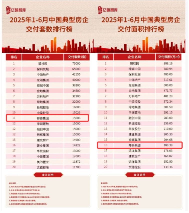 據(jù)億翰智庫近日公布的《2025年1 - 6月中國典型房企交付業(yè)績排行榜》,邦泰交付規(guī)模再創(chuàng)新高,交付套數(shù)躋身TOP11,交付面積位列TOP16。日益穩(wěn)進的交付實力,無疑成為客戶選擇邦泰的堅實保障,讓每一位業(yè)主都能安心、放心地開啟新生活。