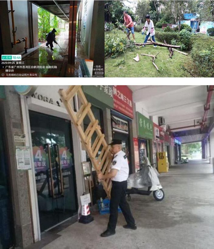 臺(tái)風(fēng)來(lái)臨前48小時(shí),廣州分公司即刻啟動(dòng)應(yīng)急指揮體系,成立多支專項(xiàng)小組覆蓋全域服務(wù)區(qū)域。各項(xiàng)目全面排查風(fēng)險(xiǎn)隱患:對(duì)廣告牌、高空懸掛物實(shí)施加固處理,消除墜落風(fēng)險(xiǎn);對(duì)臨水區(qū)域提前部署防水設(shè)施,疏導(dǎo)地下空間車輛,嚴(yán)防積水內(nèi)澇;對(duì)綠化密集區(qū)域加強(qiáng)樹木固定與排水系統(tǒng)疏通,確保臺(tái)風(fēng)期間設(shè)施安全穩(wěn)定。全員動(dòng)員落實(shí)“一區(qū)域一預(yù)案”,確保每項(xiàng)措施精準(zhǔn)到位。
