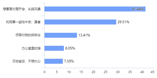 問及被調(diào)查者在“自主隔離期間你最想念辦公室的什么?”四成的被調(diào)查者選擇了想要面對面開會,頭腦風(fēng)暴。
