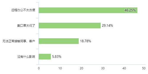在針對“疫情期間對上班的最大影響是什么?”的調(diào)查中,46.25%的受訪者選擇了“遠(yuǎn)程辦公不太方便”。18.78%的受訪者選擇了“無法正常接觸同事、客戶”。這兩個選項加在一起,即近三分之二的受訪者表達(dá)了對于遠(yuǎn)程辦公體驗的不滿。
