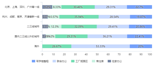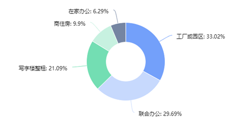 疫情當(dāng)前,很多城市都對復(fù)工企業(yè)提出了員工安全距離的要求。而且對于辦公室的通風(fēng)狀況也提出了更高的要求。根據(jù)此次的調(diào)查,目前的上班族們在工廠、園區(qū)和傳統(tǒng)的商業(yè)寫字樓辦公的較多,占比均達(dá)到三分之一。聯(lián)合辦公(或稱共享辦公)作為從2015年隨著雙創(chuàng)熱潮出現(xiàn)的全新的共享經(jīng)濟(jì)下的商業(yè)地產(chǎn)運營新模式,這幾年來越來越受到青睞,與商住房共同構(gòu)成剩下的三分之一,整體上還尚未取代傳統(tǒng)的寫字樓租賃。