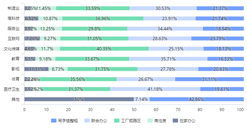 而從受調(diào)查者目前從事的行業(yè)與對于理想辦公環(huán)境的選擇來進(jìn)行交叉分析,我們不難看出,對于工廠或園區(qū)的需求在制造業(yè)、高科技等產(chǎn)業(yè)上的受青睞程度更高,而教育、服務(wù)業(yè)以及在這次的疫情下快速成長的醫(yī)療衛(wèi)生行業(yè)對于聯(lián)合辦公的青睞度更高。