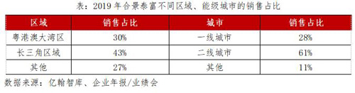 在深耕粵港澳大灣區(qū)和長三角區(qū)域,聚焦一二線城市發(fā)展戰(zhàn)略指引下,合景泰富在相應(yīng)地區(qū)的銷售金額也逐年提升,進(jìn)而為企業(yè)的營業(yè)收入增長以及盈利能力奠定了基礎(chǔ)。2019年合景泰富在兩大核心城市群的銷售業(yè)績占比合計73%,一二線城市的銷售業(yè)績在總業(yè)績中占89%。