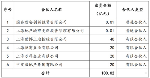 除萬(wàn)科、招商蛇口外,上海世博土地控股認(rèn)繳出資40億元,中交房地產(chǎn)集團(tuán)認(rèn)繳出資20億元。上海城市更新引導(dǎo)基金將聘請(qǐng)國(guó)君創(chuàng)投擔(dān)任基金的管理人,雙方分別出資0.01億元。