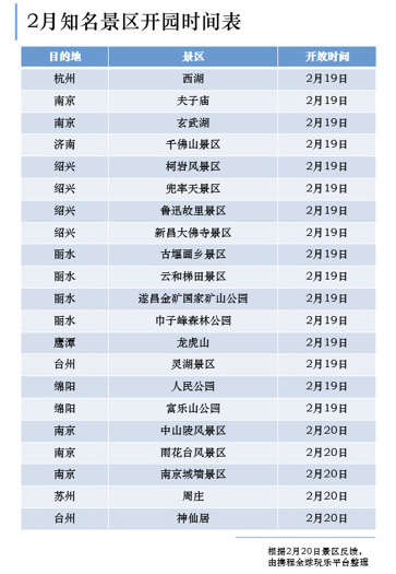 2月20日,攜程全球玩樂平臺(tái)發(fā)布了首批“知名景區(qū)開放時(shí)間表”,根據(jù)景區(qū)公布的信息,包括杭州西湖;南京夫子廟、玄武湖;濟(jì)南千佛山景區(qū)、紹興柯巖風(fēng)景區(qū)、魯迅故里景區(qū);浙江麗水古堰畫鄉(xiāng)景區(qū)、云和梯田景區(qū);江西鷹潭龍虎山;蘇州周莊;浙江臺(tái)州神仙居等20多家知名景區(qū)已于2月20日前開園。