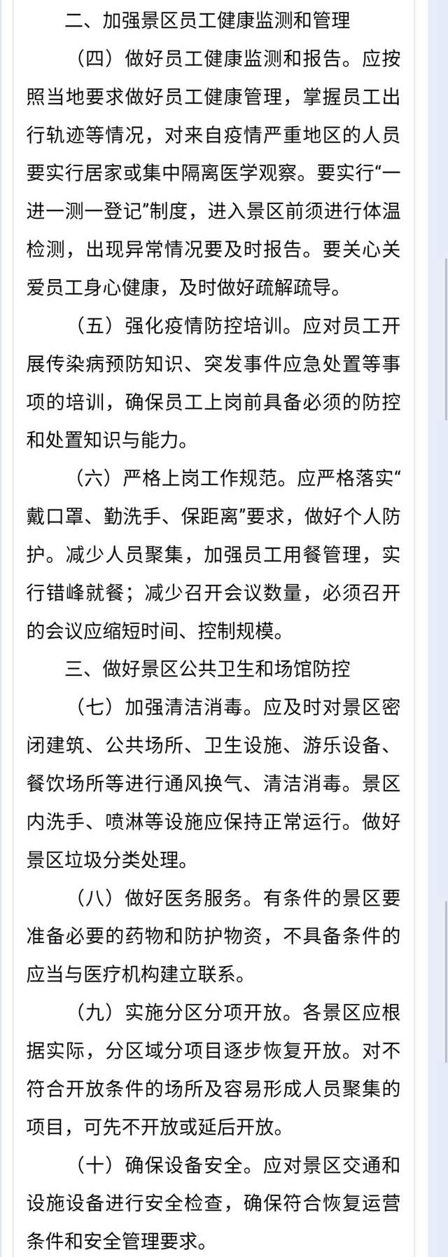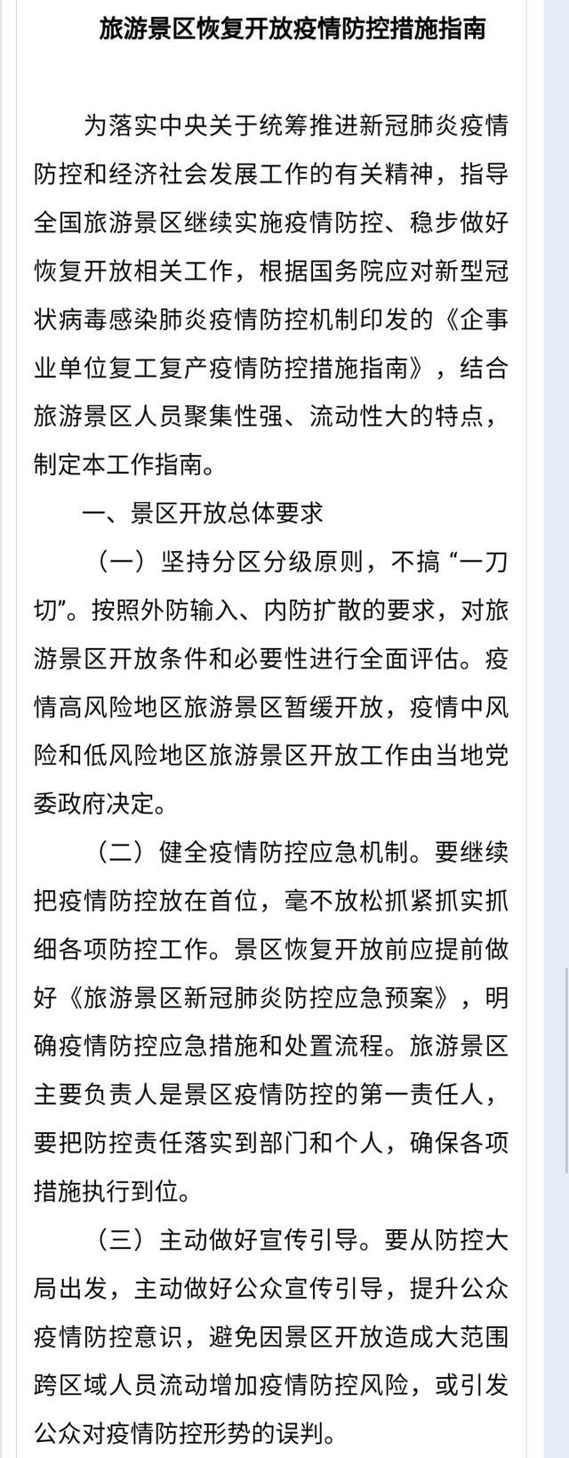 【文旅部緊急發(fā)文:#疫情高風(fēng)險地區(qū)景區(qū)暫緩開放#】#避免景區(qū)開放引發(fā)公眾誤判#文化和旅游部資源開發(fā)司25日印發(fā)《旅游景區(qū)恢復(fù)開放疫情防控措施指南》,疫情高風(fēng)險地區(qū)旅游景區(qū)暫緩開放,疫情中風(fēng)險和低風(fēng)險地區(qū)旅游景區(qū)開放工作由當(dāng)?shù)攸h委政府決定。避免因景區(qū)開放造成大范圍跨區(qū)域人員流動增加疫情防控風(fēng)險,或引發(fā)公眾對疫情防控形勢的誤判。應(yīng)實行實名制購票,采取適當(dāng)方式完整記錄入園游客聯(lián)絡(luò)方式、來往交通等信息,做到可查詢可追蹤。