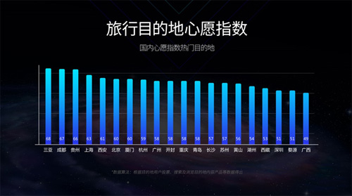 具體來看,目前國內(nèi)的疫后心愿指數(shù)整體前三名分別是三亞、成都、貴州。其中三亞、成都和貴州的綜合指數(shù)分別達到68、67和66。從出境市場來看,除了泰國、日本、新加坡三個“老朋友”,目的地心愿指數(shù)排名靠前的目的地還包括越南、迪拜、印度尼西亞、馬來西亞等國家或地區(qū)。