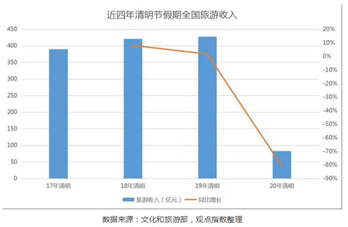 數(shù)據(jù)顯示,2020年清明假日期間,國內(nèi)旅游接待總?cè)藬?shù)4325.4萬人次,同比減少61.4%;實(shí)現(xiàn)旅游收入82.6億元,同比減少80.7%。