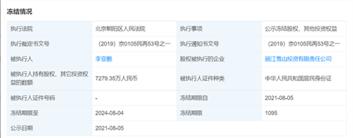 8月9日,澎湃新聞在天眼查發(fā)現(xiàn),麗江雪山投資有限責任公司在8月5日新增一條被執(zhí)行人信息,公司董事長以及最終受益人李亞鵬持有公司的7279.35萬元股權(quán)被凍結(jié),期限為3年。執(zhí)行法院為北京朝陽區(qū)人民法院,執(zhí)行通知文書號(2019)京0105民再53號之一。