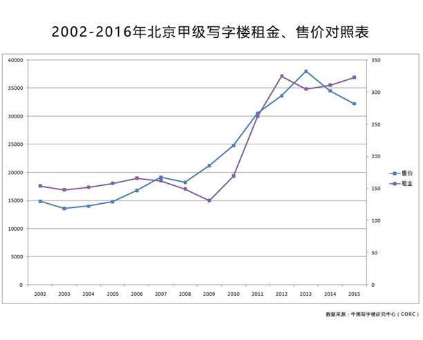 根據(jù)中國寫字樓研究中心(CORC)的最新統(tǒng)計(jì)數(shù)據(jù),截止2015年12月,北京寫字樓市場平均售價(jià)32253元/平方米(建筑面積報(bào)價(jià)),與2014年同比下降6.6%;平均租金323元人民幣/平方米/月(建筑面積報(bào)價(jià)),與2014年同比上升3.8%;平均空置率10.8%,與2015年同比下降11.5%。