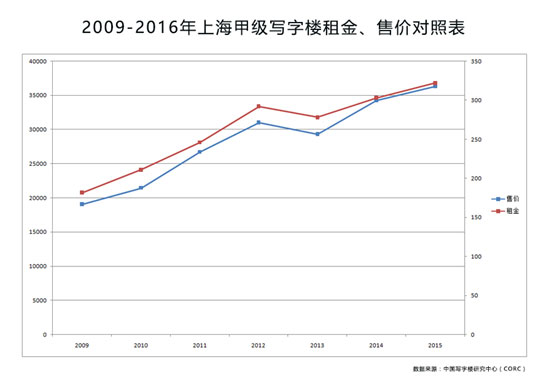 根據(jù)中國(guó)寫(xiě)字樓研究中心(CORC)的最新統(tǒng)計(jì)數(shù)據(jù),截止2015年12月,上海寫(xiě)字樓市場(chǎng)平均售價(jià)36330元/平方米(建筑面積報(bào)價(jià)),與2014年同比上升6.1%;平均租金322元人民幣/平方米/月(建筑面積報(bào)價(jià)),與2014年同比上升6.3%;平均空置率8.6%,與2014年同比下降6.5%。