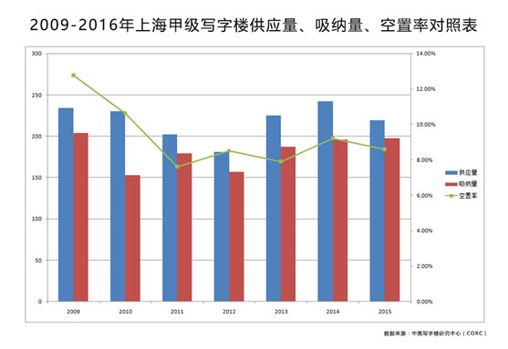 根據(jù)中國(guó)寫(xiě)字樓研究中心(CORC)統(tǒng)計(jì),2015年上海寫(xiě)字樓的全年供應(yīng)面積為267萬(wàn)平方米,與2014年同比增加10.3%;而市場(chǎng)整體吸納量為218萬(wàn)平方米,較于2014年同比增加11.2%。