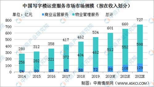 中國寫字樓運營服務(wù)市場近年來保持了快速增長。2014年中國寫字樓運營服務(wù)市場總收入280億元,2019年的534億元,復(fù)合年增長率為13.8%。隨著商業(yè)運營服務(wù)市場高速增長,預(yù)計2020年中國寫字樓運營服務(wù)市場總收入將達601億元,2022年將增至727億元。