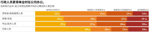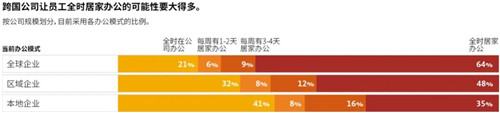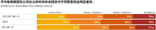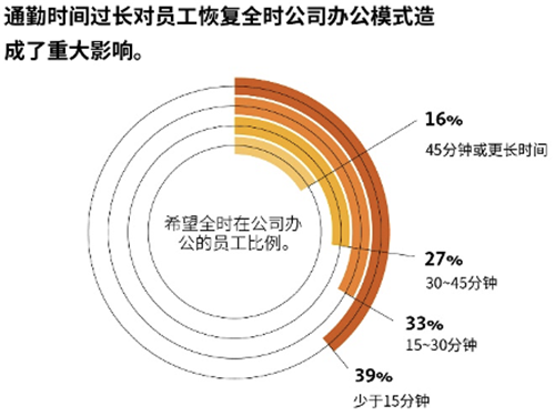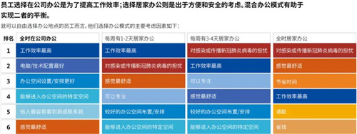 大多數(shù)員工不太能決定自己在哪工作。如果能選擇,他們會(huì)更傾向于全時(shí)在公司辦公。對許多員工來說,公司辦公比居家辦公更高效,這也是他們愿意全時(shí)或大部分時(shí)間在公司辦公的原因所在。而對于大部分時(shí)間或完全居家辦公的員工,則是出于對新冠肺炎疫情的擔(dān)憂,83%的人希望在疫情限制解除后返回工作崗位。隨著員工陸續(xù)回到公司辦公,許多人要平衡交通通勤、工作生活、健康因素和高效的工作環(huán)境等因素,因此他們往往會(huì)選擇混合辦公模式,即居家辦公和在公司辦公相搭配。