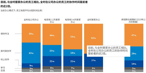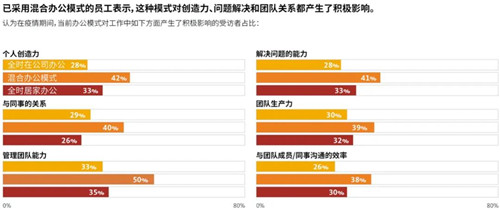 混合辦公模式具有明顯的優(yōu)勢。員工經(jīng)歷過混合辦公模式的體驗(yàn)后,他們比全時(shí)在公司辦公或全時(shí)居家辦公的人擁有更好的工作體驗(yàn)。疫情期間,采用混合辦公模式的員工在個(gè)人創(chuàng)造力、工作關(guān)系和工作效率等方面均實(shí)現(xiàn)較大提升。在混合模式下,員工通過居家辦公,可以靈活選擇與其日常職責(zé)相匹配的辦公環(huán)境,提高了辦公靈活性;在公司辦公期間又能很直觀的感受到團(tuán)隊(duì)的協(xié)作,可以與同事進(jìn)行面對面交流,彼此聯(lián)系可能更加緊密,對工作的參與度更高。