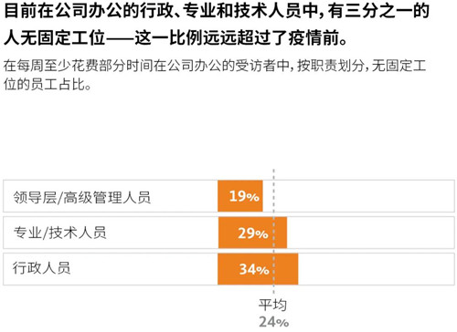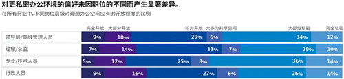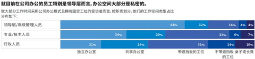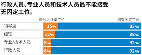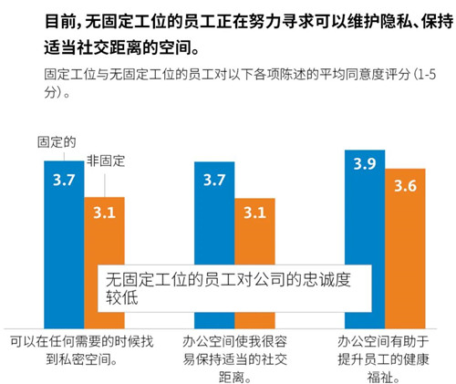 疫情之前,無固定工位的美國員工中有50%希望擁有固定工位。無固定工位主要適用于嚴(yán)重依賴面對面協(xié)作開展工作的員工,而非需要長時(shí)間集中精力辦公的員工,F(xiàn)在,希望獲得固定工位的員工比以往任何時(shí)候都多。此外,大多數(shù)美國員工愿意犧牲居家辦公的靈活性,以換取在公司辦公擁有固定工位。在返回公司辦公的領(lǐng)導(dǎo)層中,獲得自己中意工位的人員占比較高。行政人員和專業(yè)技術(shù)人員沒有固定工位的可能性要高于領(lǐng)導(dǎo)層。目前,人們發(fā)現(xiàn),與固定工位相比,無固定工位不利于保持適當(dāng)?shù)纳缃痪嚯x、隱私保護(hù)、健康福祉。