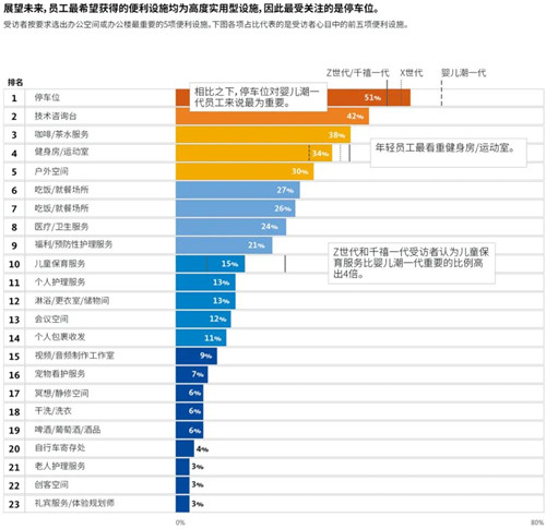 縱觀各世代員工,大部分人期望的是實(shí)用型便利設(shè)施,其中停車位穩(wěn)居榜首。