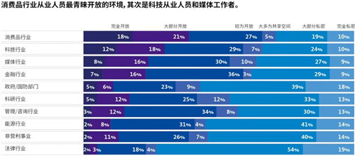 過去幾年里,員工一直要求獲得更多的私密空間。但是,66%的消費(fèi)品行業(yè)的從業(yè)人員更青睞開放環(huán)境,而73%的法律工作者則希望擁有私密環(huán)境。日常工作的內(nèi)容可能影響到對辦公環(huán)境的選擇,而每個(gè)行業(yè)的慣例也是如此。歷史數(shù)據(jù)顯示,法律事務(wù)所更注重私人辦公室,而科技公司則一直在推行更開放的辦公環(huán)境。辦公室是團(tuán)隊(duì)進(jìn)行偶然互動(dòng)、建立社交聯(lián)系的場所,也是實(shí)現(xiàn)更多協(xié)作活動(dòng)的聚焦點(diǎn)。相較于老員工,年輕員工可能更看重這些方面,也更青睞開放的辦公環(huán)境。令人驚訝的是,雖然領(lǐng)導(dǎo)層更有可能擁有私人辦公室,但跨職能的員工同樣青睞既私密又開放的環(huán)境。