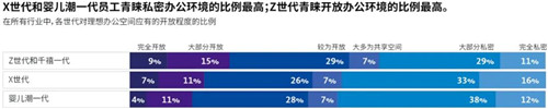 大多數(shù)員工都希望能靈活選擇居家辦公,同時(shí)花一些時(shí)間進(jìn)辦公室辦公。雖然希望整個(gè)工作日都居家辦公的員工比例相對穩(wěn)定,但希望全時(shí)在公司辦公的員工比例因行業(yè)不同而有所差異。消費(fèi)品行業(yè)的從業(yè)人員、科研人員和政府/國防部門的工作人員更青睞全時(shí)在公司辦公。與嬰兒潮一代相比,X世代和千禧一代的員工更青睞混合辦公模式。依據(jù)個(gè)人的工作職能對特定辦公空間或面對面協(xié)作的依賴程度,辦公模式的偏好可能有所不同。另外,偏好選擇也可能因家庭或辦公室環(huán)境的效能而有所不同,其中高效的環(huán)境將決定個(gè)人更青睞于在哪里辦公。