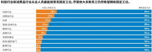 新冠肺炎疫情爆發(fā)前,無固定工位正成為一種潮流。如今,絕大多數(shù)員工更青睞擁有固定工位,這一點(diǎn)在不同的行業(yè)、世代和職位上幾乎無差別。與偏愛開放辦公環(huán)境的趨勢類似,年輕員工、科技行業(yè)人員和領(lǐng)導(dǎo)層對共享工位模式持開放態(tài)度的比例更高,但比例差距不大。在靈活辦公和固定工位之間做選擇時(shí),很大一部分員工會(huì)選擇靈活辦公。然而,縱觀所有行業(yè),大多數(shù)員工仍然會(huì)選擇固定工位。對無固定工位模式的接受程度和選擇該模式進(jìn)行工作之間可能存在某種聯(lián)系,因?yàn)榉蓮臉I(yè)人員最有可能犧牲靈活性去換取固定工位。