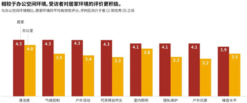 雖然在新冠肺炎疫情爆發(fā)前,許多員工偶爾居家辦公,但只有10%的人會(huì)將這種辦公模式固定下來,作為每周正常工作的一部分。在比較居家辦公和公司辦公的環(huán)境時(shí),居家辦公的績效要優(yōu)于其他大多數(shù)辦公模式,尤其是在個(gè)人工作績效方面。辦公室仍然被視為開展協(xié)同辦公和建立社會(huì)關(guān)系的催化劑;居家辦公并不能輕易取代與同事們面對面的協(xié)作,但我們逐漸發(fā)現(xiàn),居家辦公的體驗(yàn)也提高了辦公環(huán)境的標(biāo)準(zhǔn)。值得注意的是,住宅的內(nèi)部裝修在戶外空間、隱私性、噪音、氣候控制和可調(diào)節(jié)性等方面均優(yōu)于辦公室。