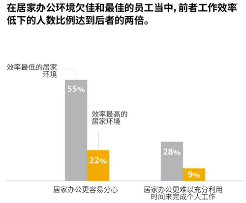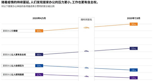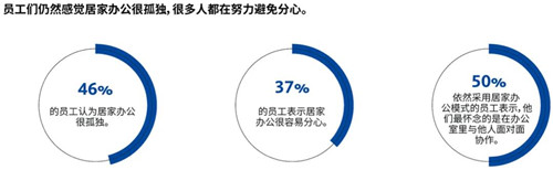 盡管依然有將近一半的員工覺得居家辦公比較孤獨(dú),但相較于疫情爆發(fā)的頭幾周,認(rèn)為居家辦公方便且能獲得更大授權(quán)的員工比例有所增加。居家辦公幾個(gè)月后,很少再有員工感覺這種辦公模式帶來壓力或令人困惑。員工們也意識(shí)到居家辦公帶來的實(shí)際好處,大多數(shù)人認(rèn)為居家辦公更容易取得工作和生活之間的平衡,同時(shí)還能避免分心。在最近的一次調(diào)查中,認(rèn)為在家里難以與他人合作以及與同事保持溝通的員工比例有所降低。然而,大多數(shù)員工仍然認(rèn)為,居家辦公會(huì)增加與他人溝通的難度。