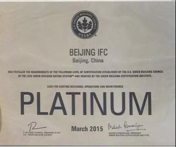 北京IFC同步國際節(jié)能、環(huán)保設(shè)計標準,榮獲LEED-EB鉑金級認證。