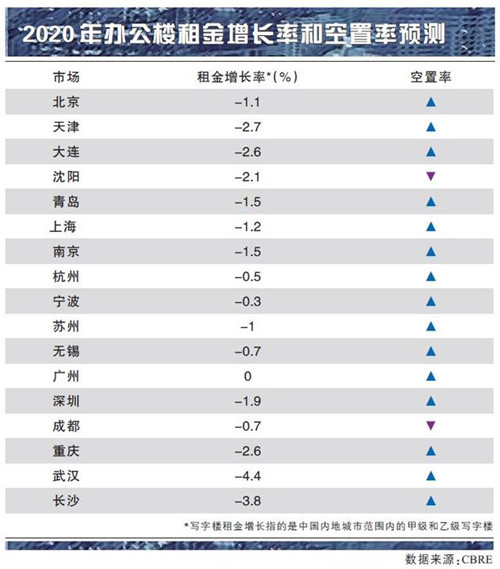 這意味著,如果疫情如預(yù)期一樣能夠在4月底基本解除,寫字樓空置率并不會因為疫情的沖擊而明顯上升。但全國范圍看,寫字樓空置率面臨持續(xù)走高的壓力。世邦魏理仕預(yù)測,2020年全國寫字樓空置率將攀升至25%,15個城市的空置率或達(dá)歷史最高水平。