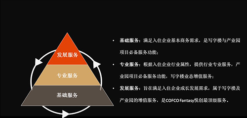 COFCO FANTASY由基礎(chǔ)服務(wù)、專業(yè)服務(wù)及發(fā)展服務(wù)三級(jí)構(gòu)成,滿足企業(yè)租戶不同發(fā)展階段的需求,涵蓋了從工、商、法、稅、人到會(huì)議、培訓(xùn)、市場、研發(fā)等針對(duì)企業(yè)不同時(shí)期、不同階段的各項(xiàng)增值服務(wù)。COFCO FANTASY的誕生讓企業(yè)看到了未來的無限可能。