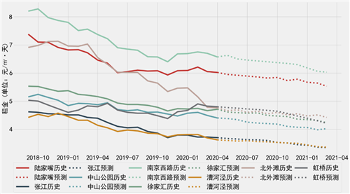 圖:上海8大商圈甲乙級(jí)寫字樓歷史租金及未來走勢預(yù)測(2018年9月~2021年3月)