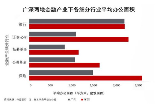 這一系列的制度創(chuàng)新舉措將利好境內(nèi)外金融機(jī)構(gòu)在大灣區(qū)內(nèi)地業(yè)務(wù)的快速發(fā)展,為深圳和廣州的辦公樓市場(chǎng)需求帶來(lái)新的增長(zhǎng)點(diǎn)。從仲量聯(lián)行統(tǒng)計(jì)的金融產(chǎn)業(yè)各細(xì)分行業(yè)在甲級(jí)辦公樓中平均辦公面積結(jié)果可知: