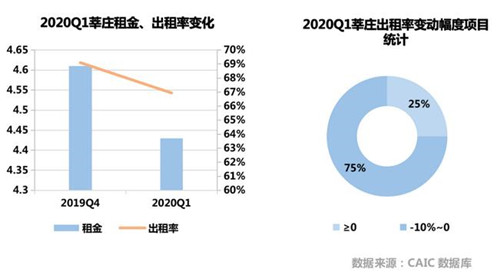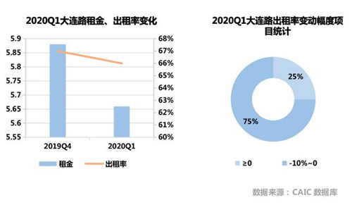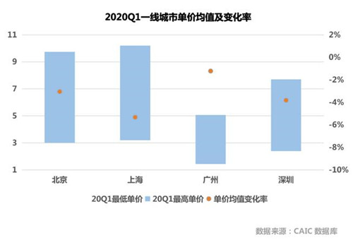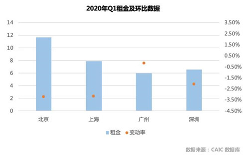 2020年一季度一線城市平均租金降幅超前5個(gè)季度的租金平均降幅2.1%,達(dá)到2.5%;出租率下跌1.2%,不但高于前5個(gè)季度的出租率平均跌幅0.7%,創(chuàng)2019年一季度以來的最大降幅。
