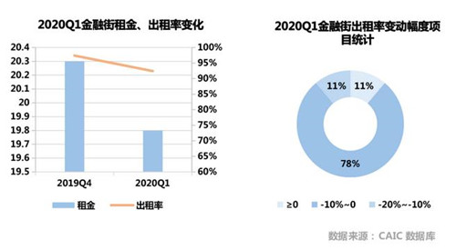 此次疫情使得北京寫字樓市場(chǎng)租賃按下了"暫停鍵",對(duì)于長期價(jià)格和出租率堅(jiān)挺的金融街也出現(xiàn)了松動(dòng)。2020年一季度金融街租金、出租率都出現(xiàn)了明顯下降,其中有11%的項(xiàng)目出租率變動(dòng)幅度達(dá)10-20%。