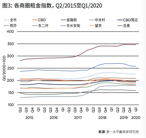 這些商圈都有近兩年供應(yīng)加快的大背景。由此,疫情期間市場需求走弱、成交擱置等因素影響下,業(yè)主方不得不繼續(xù)調(diào)整租賃策略并降低租金期待值,這使全市甲級寫字樓平均租金連續(xù)五季環(huán)比下跌。