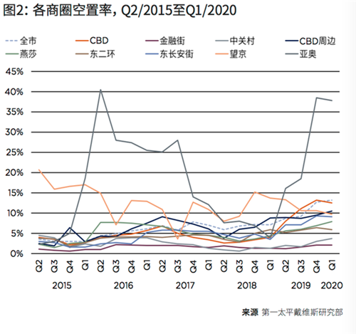 到了今年一季度,仍有少部分樓宇繼續(xù)供應(yīng),空置率上調(diào)到了13.2%。第一太平戴維斯披露的商圈空置率顯示,今年一季度,CBD空置率仍處12.5%高位,亞奧商務(wù)區(qū)達(dá)37.8%,麗澤商務(wù)區(qū)空置率調(diào)至68.2%。