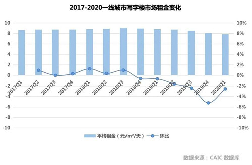 據(jù)CAIC數(shù)據(jù)統(tǒng)計(jì),2020年一季度一線城市平均租金降幅超前5個(gè)季度的租金平均降幅2.1%。出租率下跌1.2%,高于前5個(gè)季度的出租率平均跌幅0.7%,創(chuàng)2019年一季度以來的最大降幅。其中北京平均租金已經(jīng)連續(xù) 6 個(gè)季度下跌,一直處于下行態(tài)勢(shì)。