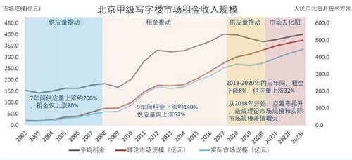 縱觀北京甲級寫字樓市場發(fā)展的歷史,整體租金收入規(guī)模從2002年的大約30億元左右,增長到2019年的大約420億元,18年間增長大概14倍,預(yù)計(jì)到2023年整體理論市場規(guī)模將達(dá)到500億元。