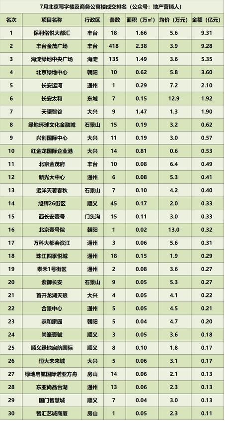 其中,保利佲悅大都匯以9.31億元的月度成交額位居成交榜首,豐臺金茂廣場以9.28億元的成交額緊隨其后,海淀綠地中央廣場以5.35億元成交額位列第三。