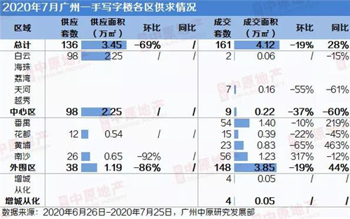 7月廣州一手寫字樓市場(chǎng)供應(yīng)較上月10.97萬㎡的高位,回落69%,但仍然有136套3.45萬㎡的新貨入市。