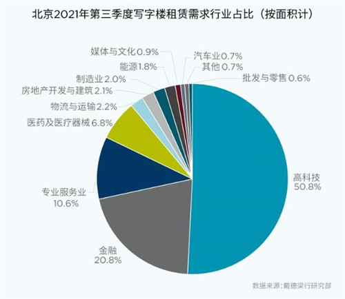 三季度,得益于市場態(tài)勢活躍和需求強勁,北京全市寫字樓季度凈吸納量高達(dá)24.2萬平方米,為自2018年二季度以來單季最高值。細(xì)分到具體行業(yè)來看,高科技企業(yè)持續(xù)活躍,成交占總成交面積的50.8%,其次為金融業(yè)和專業(yè)服務(wù)業(yè),分別占成交總面積的20.8%和10.6%。