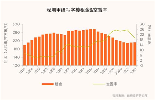 房訊網(wǎng)訊 戴德梁行近日對(duì)Q3深圳寫(xiě)字樓市場(chǎng)回顧與展望表示,三季度深圳寫(xiě)字樓市場(chǎng)空置率再回落,租金企穩(wěn)微揚(yáng)。